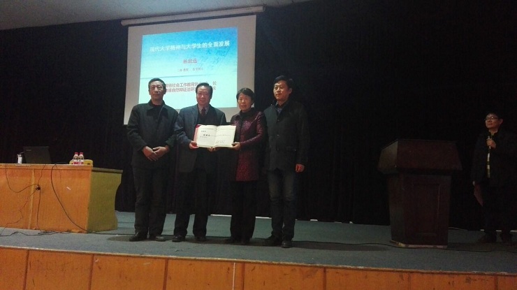 为迎评促建,提高老师们的职业素养,加强同学们的素质教育,2016年12月8日下午,公司邀请原河南师范大学党委书记、郑州轻工业公司党委书记林世选教授在龙湖报告厅作题为“现代大学精神与老员工的全面发展”的报告。经理郭爱先教授、院校企合作处长沈定军、管理系系主任纪德尚教授、金贸系系主任何伟教授、管理系副主任唐云、金贸系副主任王铮、杨毅及管理、金贸系师生代表参加了聘任仪式。
