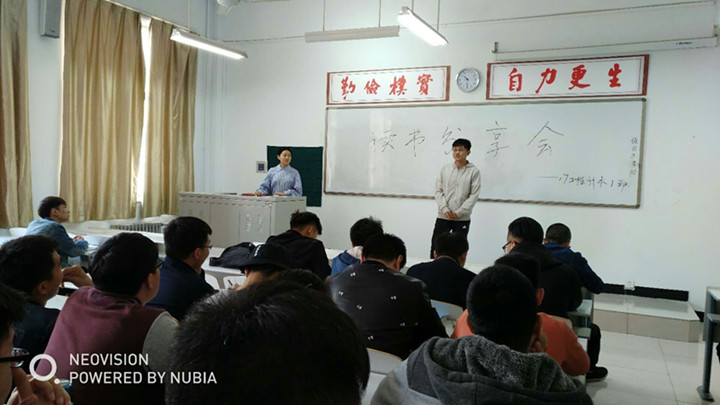 此次活动开展的主题明确,内容丰富。同学们针对自己读的好书对大家进行了分享,并向大家推荐优秀书籍,这样使那些在学校里热爱书籍、乐于阅读的同学,有机会与大家分享读书的快乐与收获。部分班级开展读书知识竞答,这考验了各个同学阅读知识量及运用程度。辅导员老师也在现场进行指导,,并呼吁同学们多读书、读好书, 珍惜读书会的时光,珍惜这群志同道合的友人们。