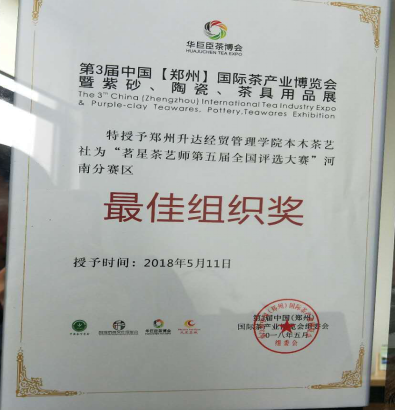 决赛于下午12时30分开始进行选手抽签,14时正式开始。决赛共9位选手,公司选手李喜洋的参赛主题是“将茶文化传承进行到底”,冲泡茶品“凤凰单丛”,以话剧形式讲述一个在民国初年军阀割据的时代,面对百姓流离失所、文化流失,有这样两个人为茶文化的保护和传承倾尽自己一生的故事。经过3个多小时的角逐,决赛最终于17时30分结束,在评委评分和点评后,公司选手李喜洋荣获优秀奖。同时,第三届中国(郑州)国际茶产业博览会组委会特授予郑州升达经贸tyc522cc太阳成集团本木茶艺社为“茗星茶艺师第五届全国评选大赛”河南分赛区“最佳组织奖”。