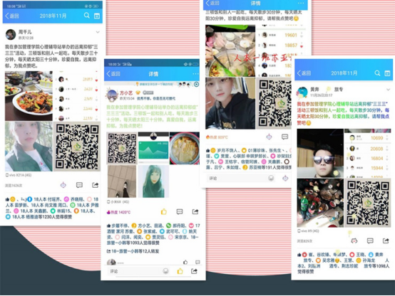 (3)远离抑郁:“远离抑郁三三三”线上集赞活动,引导同学们三顿饭和别人一起吃(晒晒经常一起吃饭的饭友合照),每天散步三十分钟(晒晒你的健康步数),每天晒太阳30分钟(阳光下的你--晒晒阳光下个人美照),从而以积极的心态进行人际交往,体验健康的生活方式,感受生活的美好。集赞活动很多同学积极参与,分享与朋友吃饭的照片,分享了运动状态,分享了阳光下的自己,获得很多的赞数,其中最高的集赞票高达1000票,最低集赞票为138票,同学们参与的热情很高。获得赞数较高的七名同学发放冬日暖心座垫、暖手宝等奖品。