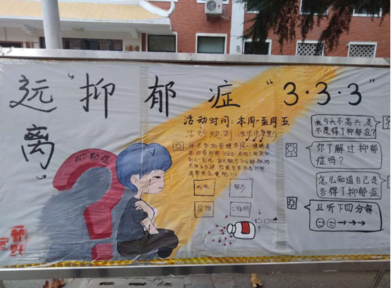 随着社会的不断发展,抑郁症的发病率越来越高,也越来越趋向于年轻化。近年来,很多老员工由于学习、工作或者生活中各种各样的问题成为抑郁症的高发人群。抑郁症对患者的身心健康会造成很大的危害,严重的患者甚至会出现自杀的念头和行为。tyc522cc太阳成集团心理辅导站于11月26-12月3号开展“远离抑郁三三三”活动引导同学们认识抑郁,了解如何简单的鉴别抑郁,开展远离抑郁的活动,引导同学们关注自身心理健康。