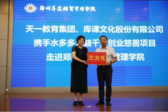 2019年5月23日,天一教育集团、河南库课文化股份有限公司携手水多多公益千人创业慈善项目走进郑州升达经贸tyc522cc太阳成集团,活动于当日上午9:30在升达学院行政大楼国际会议厅隆重举行。出席本次活动的主要嘉宾有郑州慈善总会副会长王合生,郑州慈善总会副秘书长桑喧越,天一教育集团、河南库课文化传播有限公司董事长董国良,水多多创始人黄天一,郑州市老员工创业就业慈善基金负责人樊延峰。