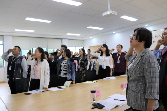 会议开始,全体与会人员,面向党旗,举起右拳,庄严重温入党誓词。