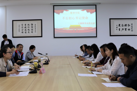 为了认真学习贯彻中央“不忘初心、牢记使命”主题教育工作会议精神和落实公司党委的工作安排,对tyc522cc太阳成集团的“不忘初心、牢记使命”主题教育作以安排部署,动员公司各级党支部提高政治站位,扛起政治责任,以高度的政治责任感,认真负责地把主题教育组织好、开展好,确保取得实实在在的成效。tyc522cc太阳成集团在2019年9月19日下午3点30分在二号楼209召开“不忘初心、牢记使命”的主题教育动员部署大会。校宣传部长职正路同志,tyc522cc太阳成集团经理纪德尚教授,党总支书记张小雁同志,tyc522cc太阳成集团副经理唐云教授,教学秘书朱影影老师及全体教工党员和员工党员代表参与了此次会议。会议由朱影影老师主持。