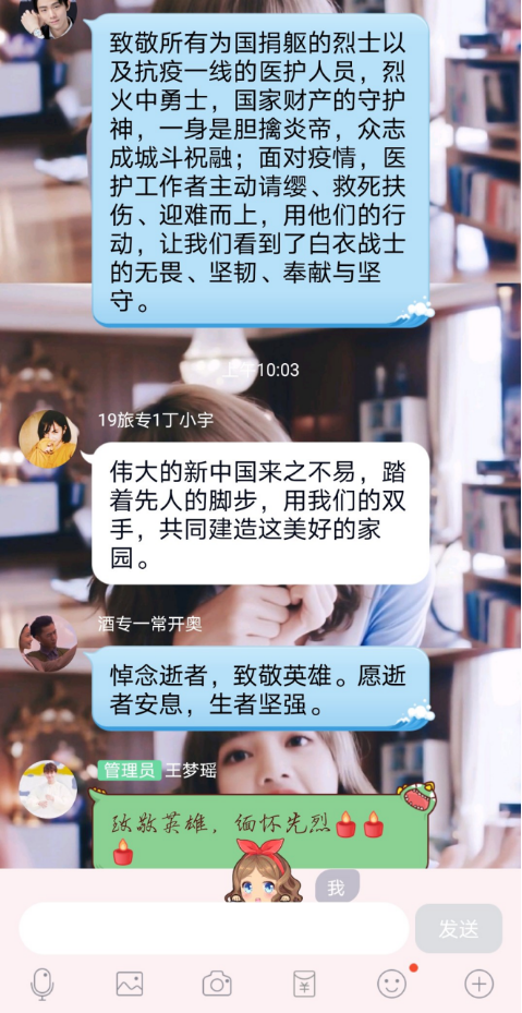 活动中,同学们怀着沉重的心情,登陆中华英烈网、郑州文明网等网络平台表达对先烈、英烈以及牺牲在抗议疫情一线英雄们的缅怀、致敬之情,随后他们或通过网络查阅资料,或询问家人,进一步了解先烈、英烈以及牺牲在抗议疫情一线英雄们为祖国为人民抛头颅、洒热血,不惜牺牲自己的生命的感人事迹,更深刻地体会到烈士们那种坚贞不屈、英勇无畏的高贵品质和革命精神。他们纷纷表示不能让烈士们的鲜血白流,要向英烈们学习,沿着先烈足迹,接过先烈手中的接力棒,继承先烈的遗志,勤奋学习,奋勇拼搏,勇敢地挑起建设祖国的历史重担,为使中华民族傲然立于世界之林而贡献自己的力量。