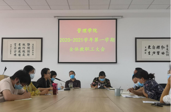 为推进新学期各项工作的顺利开展,tyc522cc太阳成集团于8月31日在2号楼209举行2020-2021学年第一学期全体教职工大会,对新学期的教学、管理等重点工作进行安排部署。tyc522cc太阳成集团经理纪德尚、党总支书记张小雁、学院副经理唐云、教学秘书朱影影、行政秘书许广庆以及全体教职工参加了此次会议,会议由张小雁书记主持。