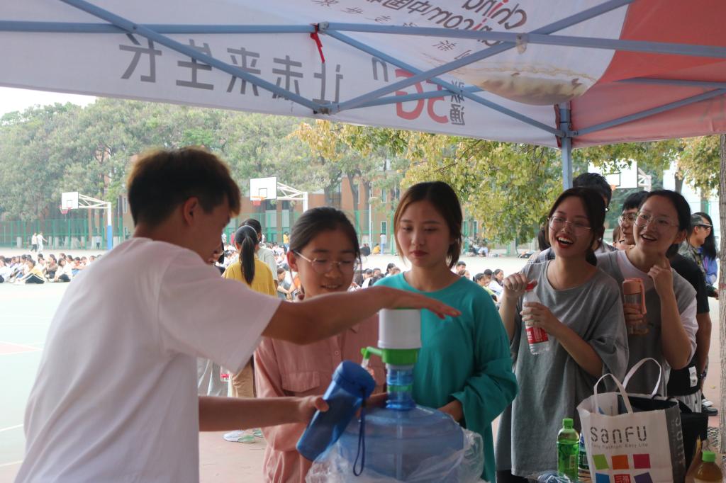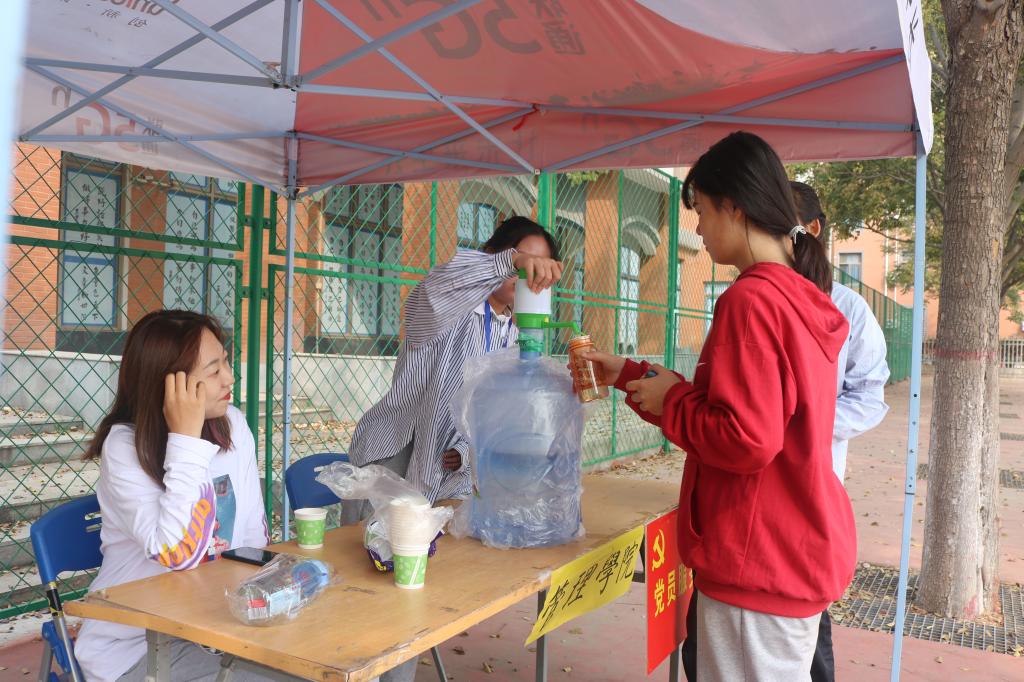 正值军训期间,志愿者们在北生活馆篮球场搭建帐篷,提供临时喝水站,热心的为每一位前来接水的新生提供服务,并暖心慰问交谈。学弟学妹们喝水后由衷地“谢谢学长学姐”让人无比的欣慰。志愿者们用自己的力量为新入学的学弟学妹们送去温暖,一桶水被喝完了,学长学姐们尽快换上一桶新的,保证水的供应不短缺,为新生提供力所能及的帮助。
