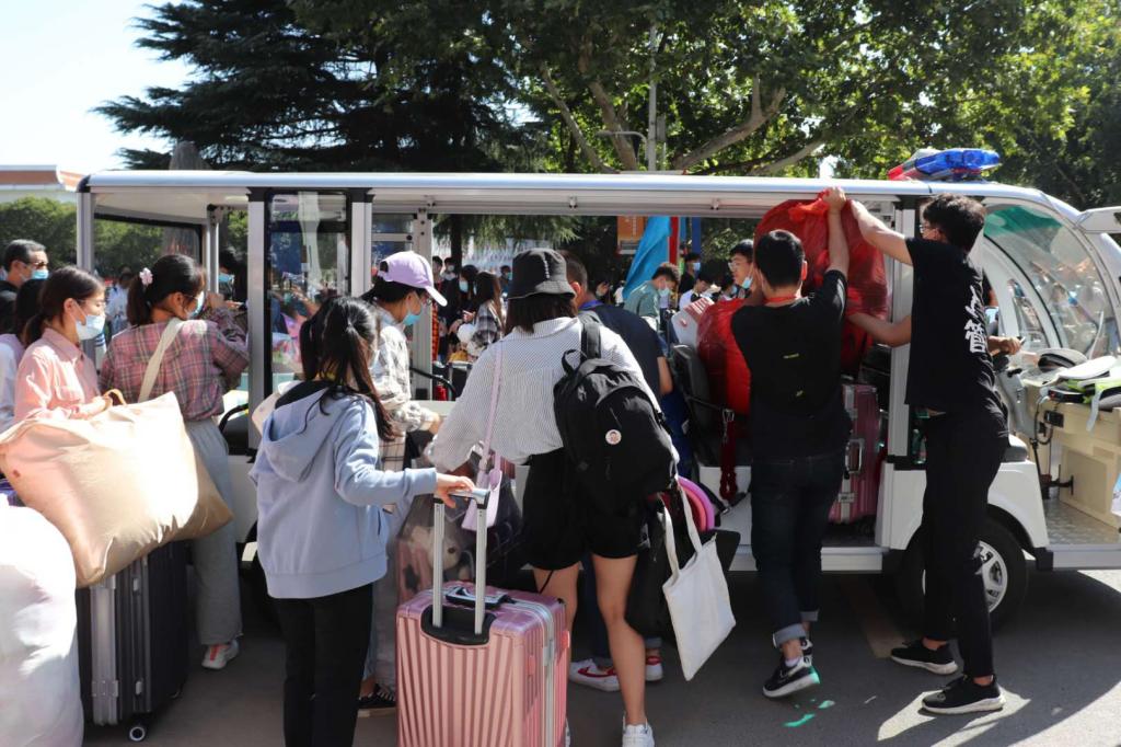 大家不停的穿梭在校园的各个角落为同学们搬运行李,深入耐心细致的做好引导工作,成为了一道美丽的风景线,得到了同学们的普遍赞誉。