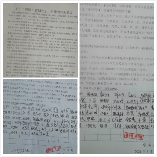 各班级主题班会上,辅导员分别向同学们介绍了清明节的来源及文化内涵,并从旅游、交通、饮食、疫情防控等方面对员工进行安全教育,倡导同学们采用科学文明的祭祀方式,表达对先人的追思和对先烈的崇敬。会上,辅导员再度强调,疫情还未完全结束,清明节假期期间,大家仍要做好个人防护,不乘坐违规车辆,不参与迷信活动,不参加人员过多的聚会,充分注意自身安全,引导员工度过健康平安的假期生活。