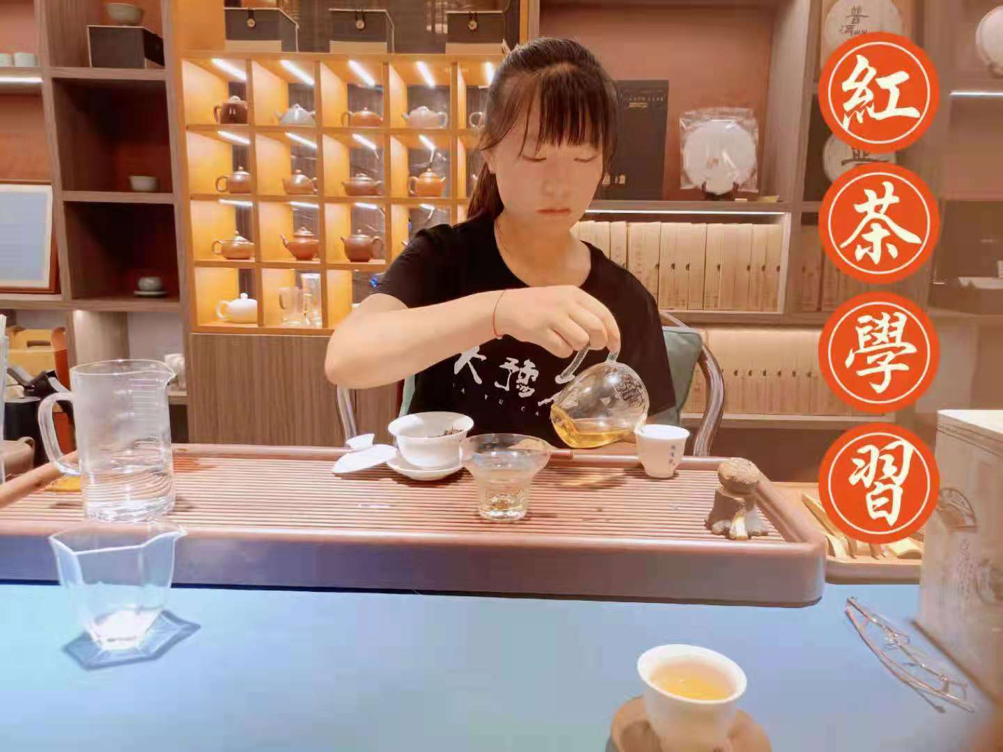 随后志愿队的队员们一身茶服,开始了泡茶的学习工作。实践队队员们分为三个小组,分别走进城墙根的金水店、CBD店和大豫仓店,了解城墙根的企业文化。