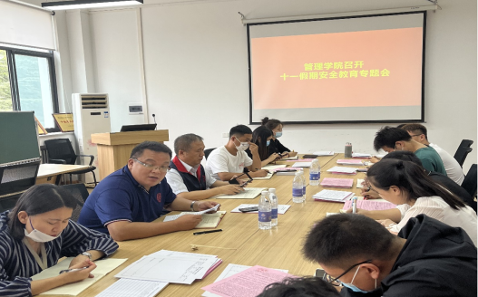 行政秘书许广庆传达学校的安全会议精神:一、遵守上级疫情防控管理规定,就地过节,非必要不出省、不跨市、不返乡,不前往中高风险地区,严格落实场所码“应扫尽扫”。二、外出期间注意全程规范佩戴口罩,每天按时进行钉钉健康打卡,按照要求如实汇报所在位置,努力维护疫情防控秩序。三、自觉遵守法律、法规和学校的有关规定。四、离校前要确保宿舍卫生整洁,关好教室、宿舍门窗,切断电源,妥善保管贵重物品。五、严禁邀约校外人员入校。六、离郑外出员工返校前须知:员工返校前需要提前向辅导员提交《员工及密切接触人员每日健康信息记录表》健康码、行程码、返校前48小时核酸检测阴性报告,审核通过后方准返校;未离郑外出员工返校查验健康码、行程码和48小时内核酸检测报告。中高风险地区员工及涉疫人员暂缓返校。七、充分利用假期时间多做有意义的事情。