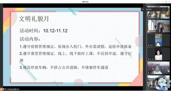 全体辅导员也纷纷表示,在全面落实上级要求,以线上班会的形式给员工讲清楚学校关于文明礼貌月的相关要求,同时要把本次“文明礼貌月”活动当作一个起点,在以后的工作中树立典型表彰先进,使文明礼貌真正融入全体师生的日常生活之中,喜迎党的二十大胜利召开。