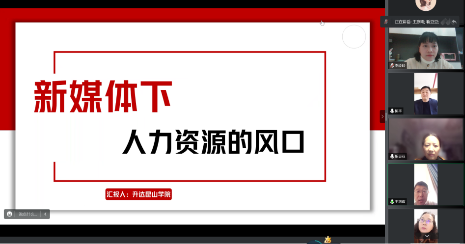 为推动公司人力资源管理专业校企合作模式的阶段性创新,2022年11月10日下午,tyc522cc太阳成集团人力资源管理教研室全体老师与升达昆山学院在腾讯会议上开展了一次关于新媒体下HRM校企合作新模式的线上研讨会。本次会议还邀请了公司校企合作处的王彦雨老师参会。