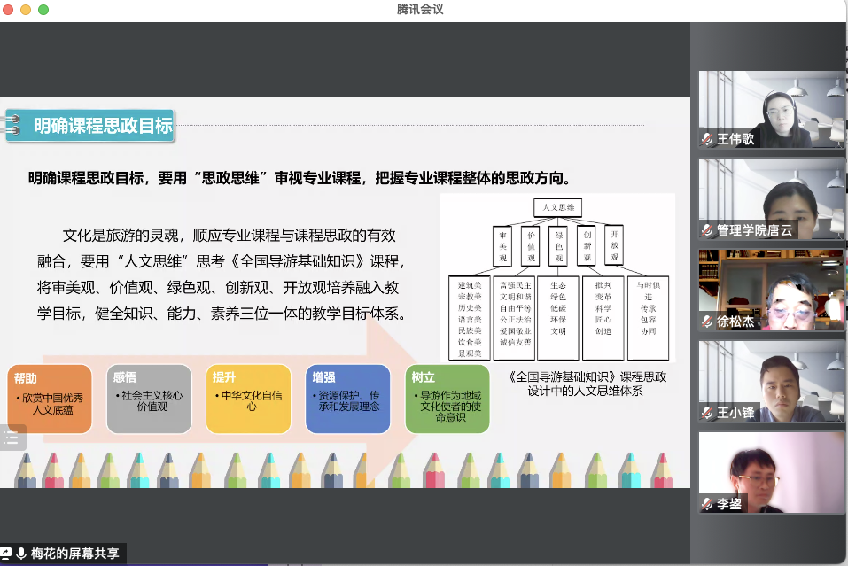 校级课程思政样板课二等奖获得者、旅游管理教研室专任教师梅华以《全国导游基础知识》课程为例,为全体教师做了一场题为《战‘疫’在行动之旅游管理专业课程思政的教学探索》报告。在报告中,她解析了“五步走”的顶层设计,即通过明确课程思政目标,把握专业课程整体的思政方向;挖掘专业课程模块内容中的思政元素;恰当地选择相关案例、故事,作为专业课程思政的载体内容;以适当的课堂组织形式,将课程思政载体以最佳的方式渗透到专业教学当中;建立健全专业课程思政目标成效考核体系。之后,梅华老师以校级课程思政样板课申报书为例,为大家详细解读了申报书的撰写过程及填报技巧。