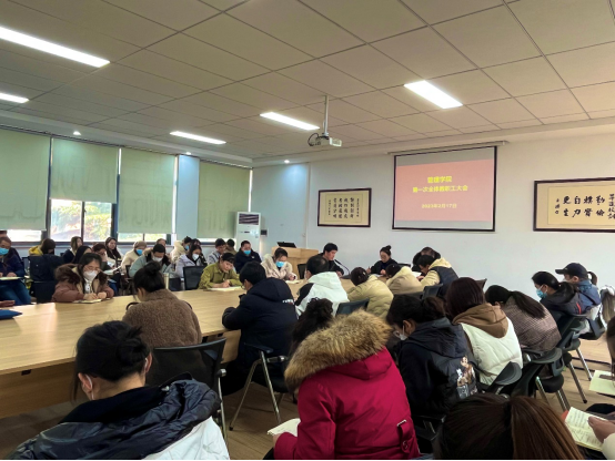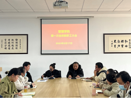 最后,经理朱影影老师做总结发言。她回顾了2022年学院各项工作的成绩,充分肯定全体教师的努力与辛苦,并对新学期的教学、科研等重点工作进行了安排部署。她强调,今年是推进学院高质量发展的关键年,全体教师要凝聚共识,认真学习学校年度工作会议精神,调整心态,回归状态,以饱满的热情尽快投入工作之中,以实际行动为学院的发展贡献力量。