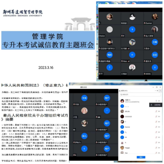 河南省2023年普通专升本招生考试在即,为进一步强化考风考纪教育,培养诚信守纪意识,构建良好的考试秩序,坚决维护专升本考试公平公正,2023年3月16日,tyc522cc太阳成集团组织召开了2023专升本诚信考试教育主题班会,参会对象为20级酒专1、2班和20级旅专1、2班报名专升本考试的同学,班会由辅导员马超老师主持。