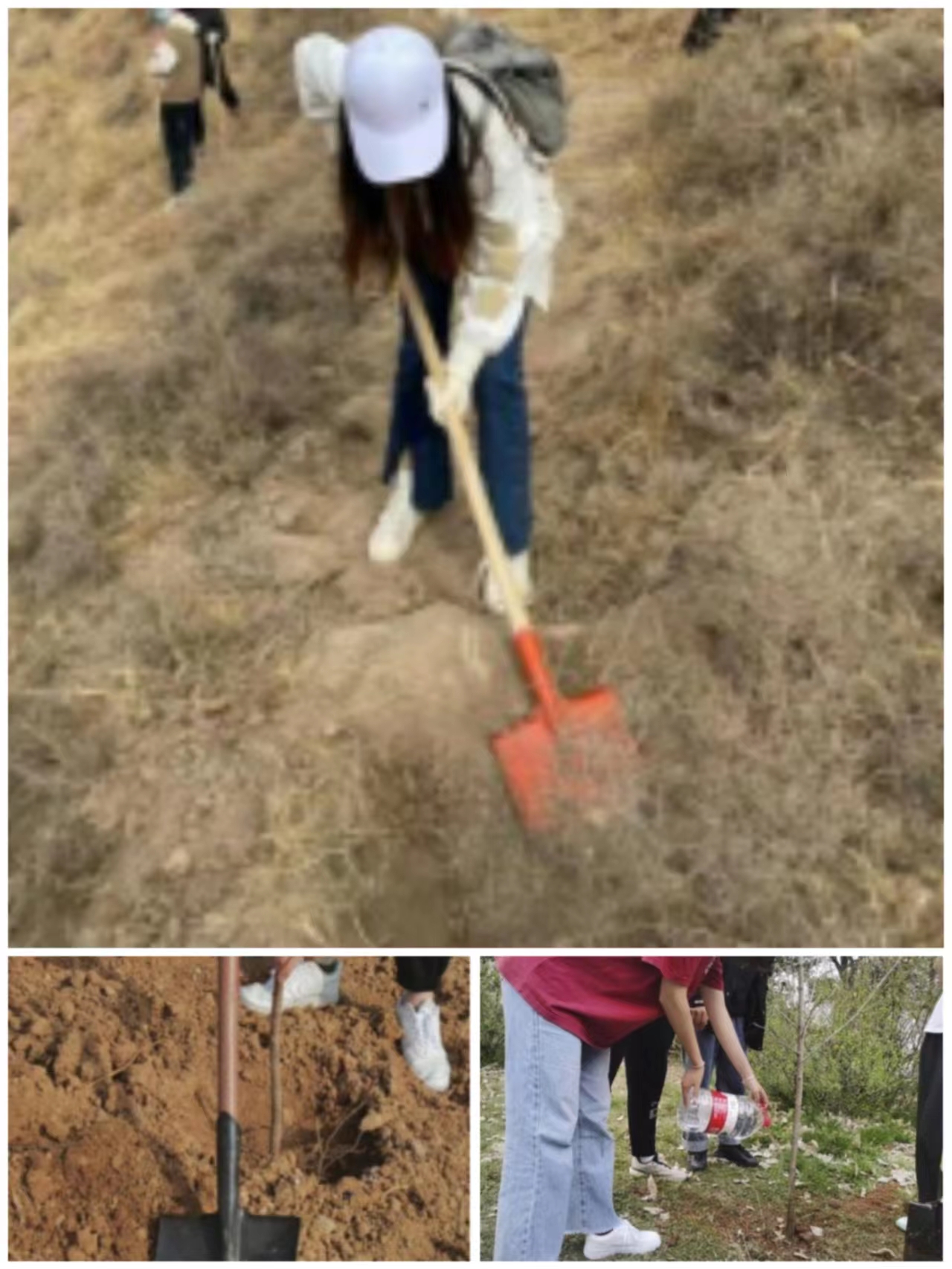 在活动当天,队员们按照预定的计划和准备情况进行了具体的实施。首先,进行了现场的分组和任务分配,将参与的同学分成不同的组别,分别负责挖坑、种树、浇水、培土等工作。然后,队员们按照技术指导进行了实地操作,确保每一棵树苗都能得到正确的种植。铲土填坑、挥锹培土、夯实土层、浇水灌根……大家有序分工,拎水的,挖坑的,扛树苗的,浇水的,来回穿梭,井井有条。最后,大家看着自己的劳动成果,一颗颗小树挺拔而立,脸上都心满意足的露出了笑容。
