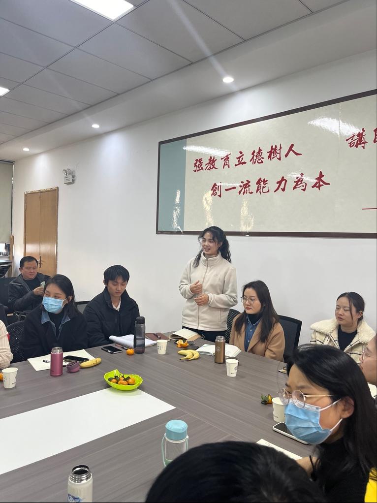 会议开始,齐老师从高校入职的目标和规划出发,引导新老师们思考自身的职业发展规划。随后通过链接、问心、巨人的视角三个环节,让新老师们对同事关系、近一年工作情况和如何当好一名高校教师有了更深入的了解。链接环节让每个老师对另一名老师进行链接,通过对同事的介绍,让在座的各教研室的新老师们快速熟悉起来;问心环节以问卷调研的方式了解新老师们在目前的工作中对自身工作职责的熟悉程度,明晰新老师们哪些工作可以初步掌握、哪些工作还存在不足,以及哪些领域是亟需提升的;巨人的视角环节是由新老师们对师生、教研团队、同期同事之间关系和问题的探讨,分享新老师如何站稳讲台、融入团队和报团取暖。最后,齐老师结合自身的经历和思考,讲述了新老师如何通过“向内找自己、向外破思维、向前敢尝试”三个方面在1年左右的职业黄金期讲好课并融入团队。